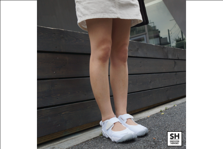 足袋のようなデザインで、スニーカーとサンダルを融合したようなフォルムの「エア リフト」。モノトーンで整えて、足元は涼しげな「エア リフト」。〈ナイキ〉のリストバンドやショルダーバッグなど、小物使いの上手さが光る。リストバンドと「エア リフト」でしっかりブランドをそろえるのは、かなりの上級テクとみた!