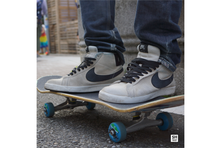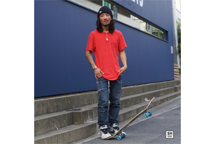 〈Levi’s SKATEBOARDING〉で固めたSFスケータースタイル。ホワイトのアッパーのシューズにあえてブラックのシューレースを合わせたところがポイント。ニットキャップはクタクタになるまで被る方がカッコいいんだよ、と教えてくれました。